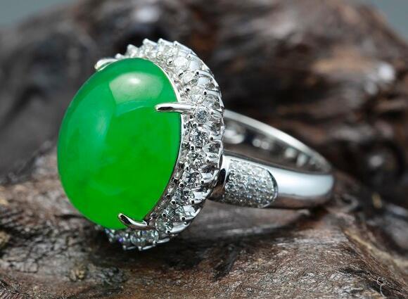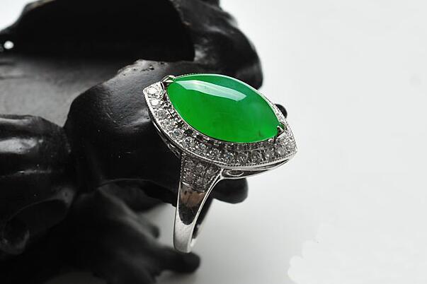镶嵌式翡翠戒指主要分成蛋面形、梨形和怀古形马鞍面的翡翠戒面这三种。因这些类型的翡翠戒面显露较多,因此能愈加真切的发觉翡翠的种色,又因为镶嵌金钻等,在佩戴的时候会闪闪发亮,让人看上去觉得雍容、华贵、沉稳。镶嵌式戒指对翡翠的技术有着极其高的要求,必须要有精工细作的技术,才能够让翡翠和其它珠宝和谐而靓丽,互相生辉。
