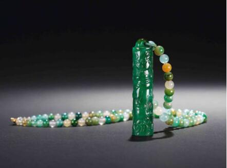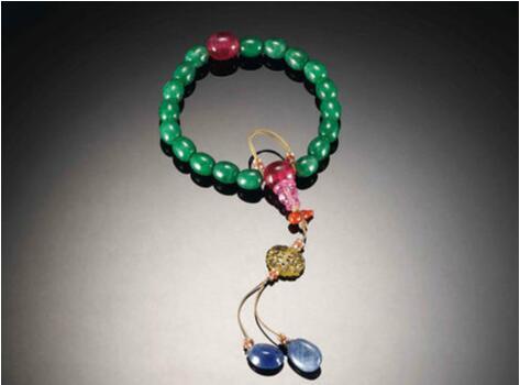 翠玉莲子形十八子手串由十八粒莲子形翠玉穿成,打磨光滑,大小一致,温润自然,沁色隐约可见。莲子象征佛祖和不受尘世垢染的心境。选材上等,多色并用,打磨雕刻技术炉火纯青,宝石、珍珠、玉石并用,做工配色皆极为精彩,体现出皇家尊贵地位。