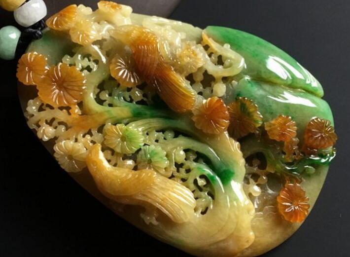 红、黄色在翡翠中本就比较罕见,美丽、好看的就更寥寥无几。像水酒黄雾、蜂蜜雾、鲜红雾那样好看的色就很少见,而冰黄、冰红的好色则更少之又少了。尤其是美丽的红、黄色可以与绿色共生而构成美丽的三彩翡翠的,则更是稀少。这就注定了品质高的三彩翡翠必定是一种奇特之物,物以稀为贵,三彩翡翠的价格必定也是昂贵的。